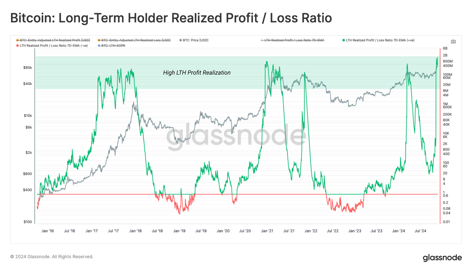 长期持有者在价格发现过程中发挥着关键作用,因为他们是先前休眠供应返回流动性流通的主要来源。随着牛市的进展,评估这一群体的获利回吐程度变得更加谨慎,因为随着价格上涨,他们往往变得越来越活跃。
