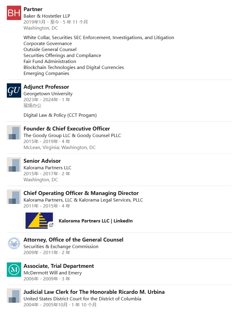 此外 Teresa Goody Guillén 还曾担任美 SEC 总法律顾问办公室诉讼律师,并在专注于企业合规、风险管理和法律战略咨询的 Kalorama Partners、提供法律和咨询服务的 The Goody Group LLC 和 Goody Counsel PLLC 担任高级职务。