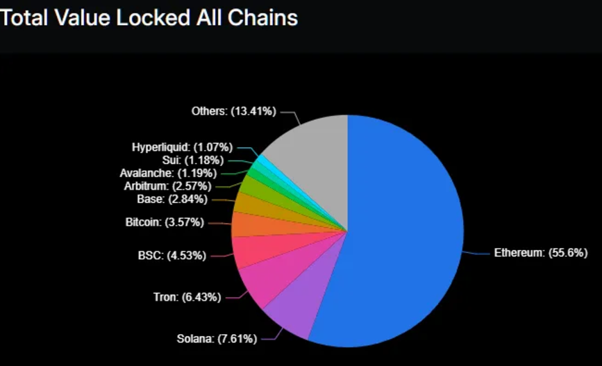 在 DeFi Llama 跟踪的 328 条区块链中,以太坊依然占据了超过 50% 的总锁仓量(TVL)。真是条「死链」呢(笑)。