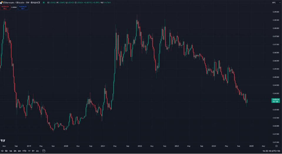 这是过去约五年里的 ETH/BTC 图表。显然,以太坊这两年的表现并不理想!但任何对图表、市场和投资稍有了解的人都会告诉你,这种时候是买入的机会,而不是卖出的时候。