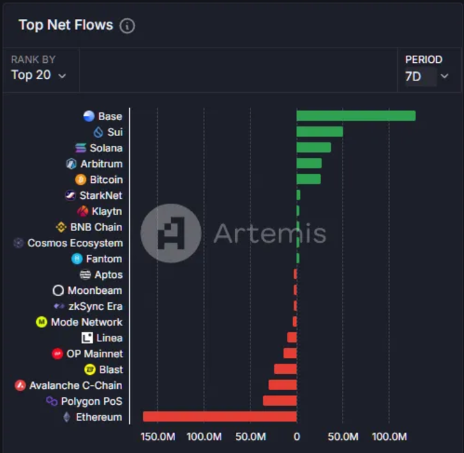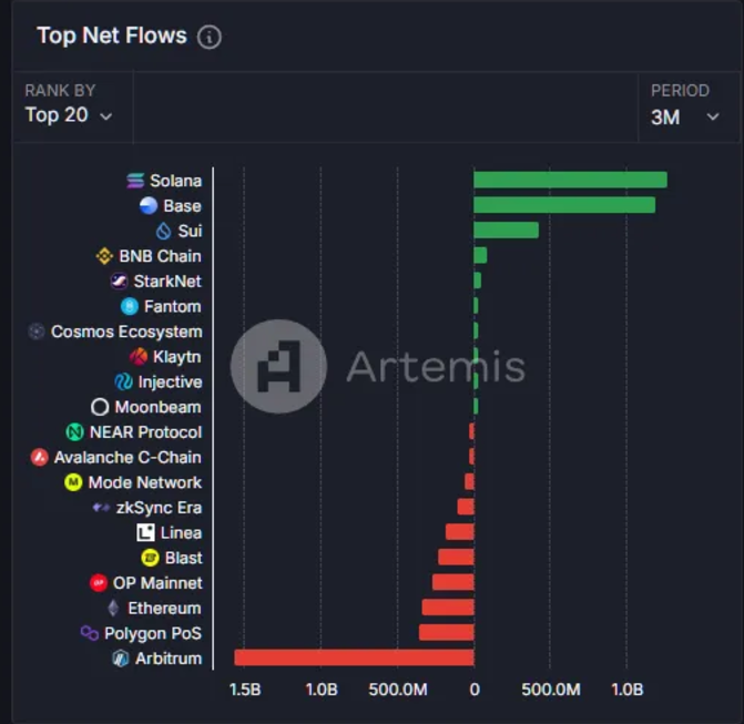 回顾过去三个月,Base 的净资金流入几乎与 Solana 相当: