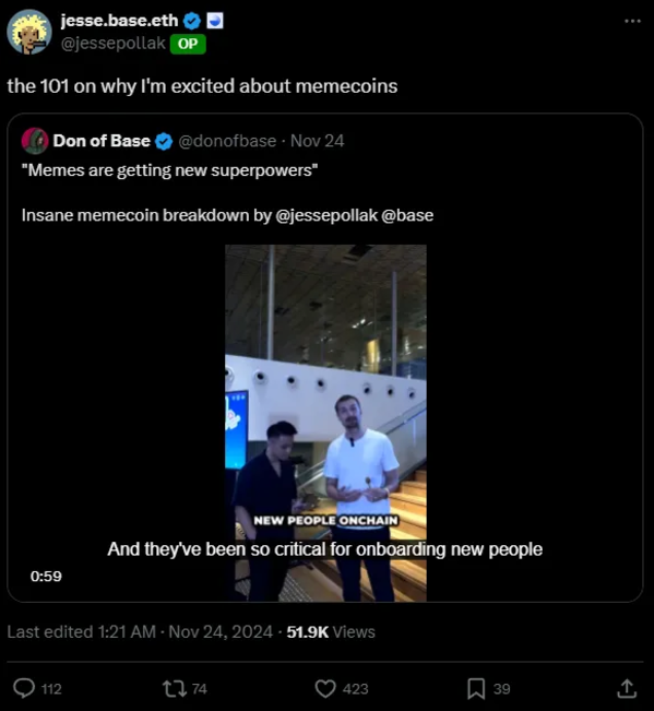 我猜测,如果我们真的迎来 Base Season,可能会有一个时刻,关注会从 AI/Farcaster 内容转向可爱动物和传统迷因(或者,可能是并行发生)。