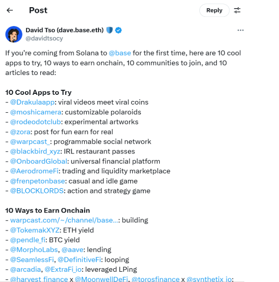 我本打算在这里写一整段内容,但刚刚看到了一条非常棒的推文,涵盖了 10 个值得尝试的酷应用、10 种赚取链上收益的方式、10 个值得加入的社区和 10 篇值得阅读的文章。所以,既然如此,我就不再啰嗦了,直接看看这条推文吧。