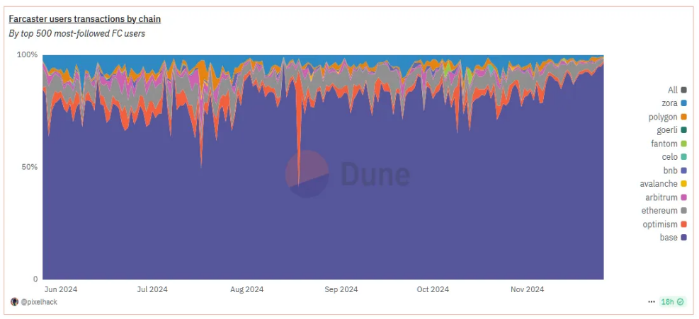 Base 和 Farcaster 是密切相关的。虽然 Farcaster 支持并使用多个链,但目前 Base 几乎在吞噬整个世界。从这张图表可以看出,今年大部分时间里,Base 占据了 Farcaster 用户所有链上交易的 60% 到 80%,而最近几天,这一数字已经达到了 95% 以上。