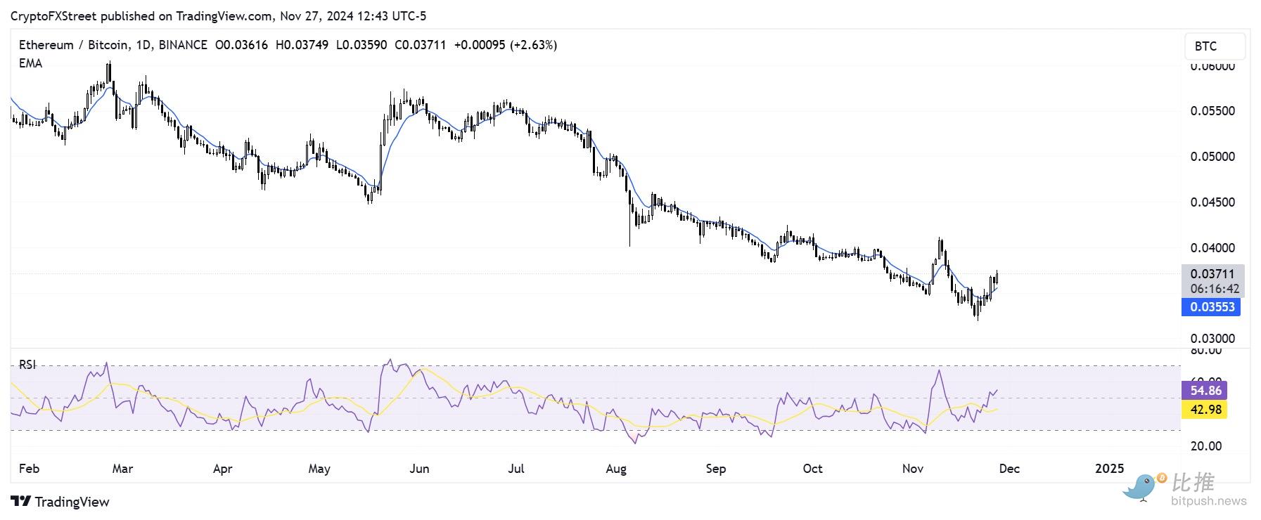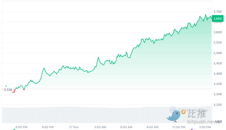 分析师表示:「在比特币下跌之后,以太坊正在卷土重来,有迹象表明市场正在将资金流转向 ETH 和山寨币」。自 11 月 21 日跌至 0.3204 美元的低点以来,ETH/BTC 比率(衡量 ETH 相对于 BTC 的表现)已飙升超过 15%。