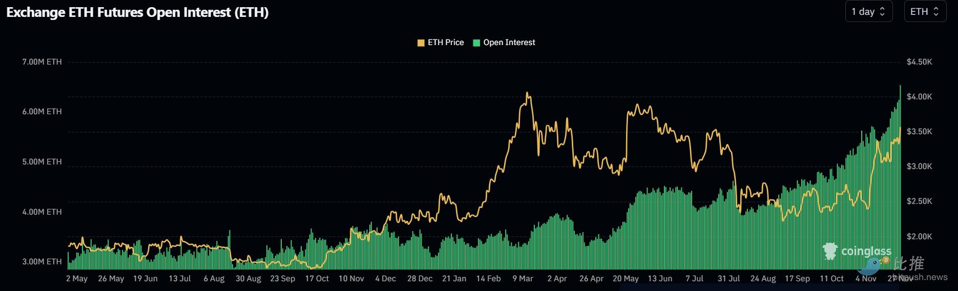 ETH 的上涨伴随着其衍生品市场的强烈看涨情绪。根据 Coinglass 的数据,ETH 未平仓合约 (OI) 周三创下 655 万 ETH 的历史新高,价值 233.4 亿美元,延续了过去两周的增长势头。此外,Velo 的数据显示,加密货币交易所币安、OKX 和 Deribit 的 ETH 三个月溢价(即其期货价格与现货价格之间的差距)飙升至 16%。