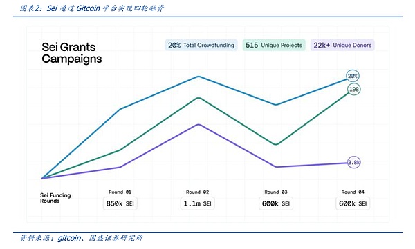 以项目Sei为例,Sei的目标是将以太坊虚拟机 (EVM) 的开发标准与 Solana 的性能相结合,实现生态应用灵活地在两条公链间扩展。根据发展不同阶段,Sei的融资规划了四轮,在四轮融资中,共融资130万美元分配给Sei生态的各类项目。Sei生态的TVL(锁仓资产价值)在7月至10月间实现了大幅增长,增长了一倍多,达到 2 亿美元以上。在此期间,活跃用户数量急剧上升,峰值达到每天约 65000 人。