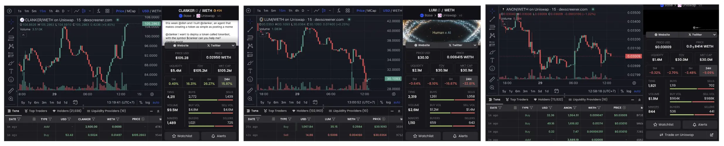 以市场价值为例,Clanker 的 CLANKER 代币市值已经达到 7000 万美元,这一数字反映了 Base 生态的巨大吸引力和当前的热潮。与传统 VC 币玩法不同,Meme 代币的崛起将链上数据和用户的交易行为反向驱动到交易所 listing,形成了一种全新的生态模式。用户通过链上积累筹码,再利用交易所流动性完成退出,这种玩法将 CEX(集中交易所)推向了市场的角落,这也是笔者认为真正牛市初期的强大暗示,类似于 2020 年 DeFi Summer 爆发的链上流动性景象。这种创新的机制展现了 Base 生态的活力,同时也暴露出其仍在市场竞争中面对的挑战。