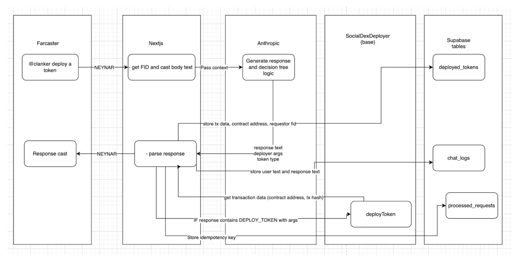 Clanker,就像一个从《Rick and Morty》穿越而来的疯狂发明,在 Base 公链的实验室中成为了现实——它是一个充满鬼点子的 AI Agent,专注于用社交媒体和智能合约把虚无缥缈的创意变成现实中的 Meme 代币。想象一下,像 Rick 一样随手一挥,@clanker 直接在 Farcaster 上部署一个 ERC-20 代币,还附带流动性池和智能锁仓功能——这不仅是科技的魔术,更是一场去中心化叙事的狂欢。Clanker 通过简化操作流程,依托 Clanker.sol 合约实现 ERC-20 代币的铸造、Uniswap V3 池的初始化、流动性注入与锁定,用户仅需在 Farcaster 上发起简单请求,即可轻松完成代币的部署和分发,目前已经打造出多个市值过千万美元的 Meme 代币。它打破了技术壁垒,让每个人都有机会成为 Meme 经济的缔造者,同时通过 40% 的手续费分成机制,为社区创造实实在在的收益。
