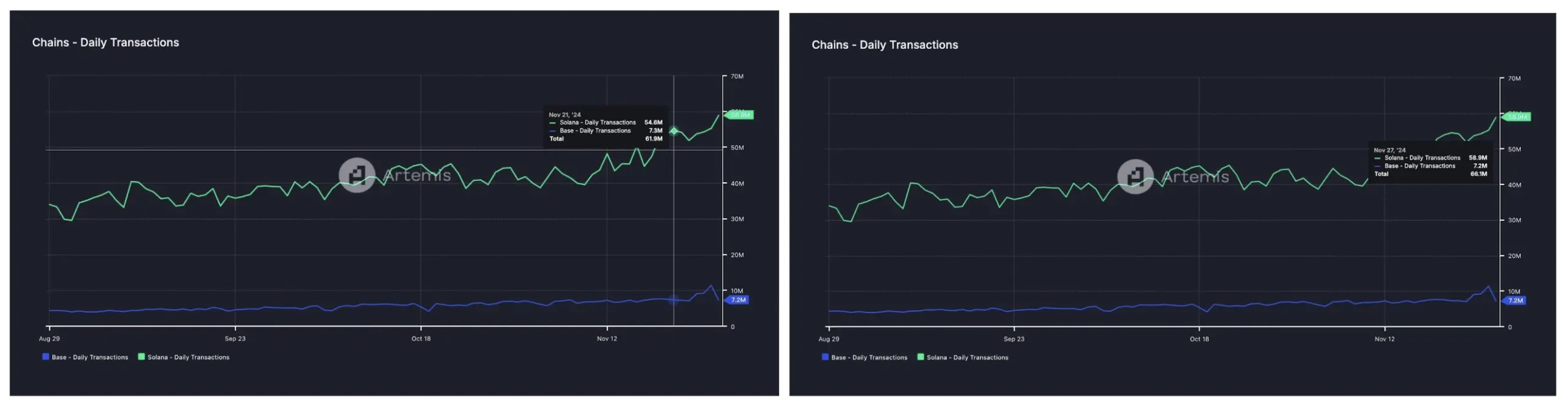 短短数月,Base 从一个相对陌生的 Layer 2 项目迅速跃升为以太坊兼容生态的领跑者,TVL(总锁定价值)突破 38.5 亿美金,超越了 Arbitrum 和 Optimism,成为 Layer 2 市场中最具竞争力的新巨头。凭借 Coinbase 的强力背书和北美资本的支持,Base 生态在 2024 年迎来了爆发式增长,11 月资金流入已超过 Solana,成为区块链领域最炙手可热的财富赛道之一。然而,尽管 Base 在资金流入和生态增长上取得显著成绩,其链上的交易量仍未超越 Solana,这表明在高速扩张的同时,Base 依然面临着持续增长和市场竞争的双重挑战。
