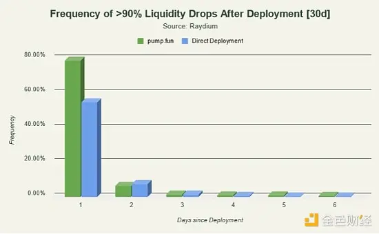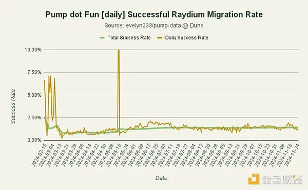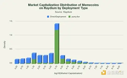 请注意,pump.fun 代币需要超过一定的市值门槛才能获得流动性池,由于发行时提供的流动性更多,因此它们的价值通常更高,多处于 5000 到 15000 美元范围内。这表明大多数发布代币无法维持或超过迁移到 Raydium 之前的市值。这些代币也有很多处于中档区间(数十万到小几百万),因为部署管道在某种程度上过滤了不吸引人的 meme,并允许社区利用此过程中在平台上获得的名声或牵引力作为增长催化剂。
