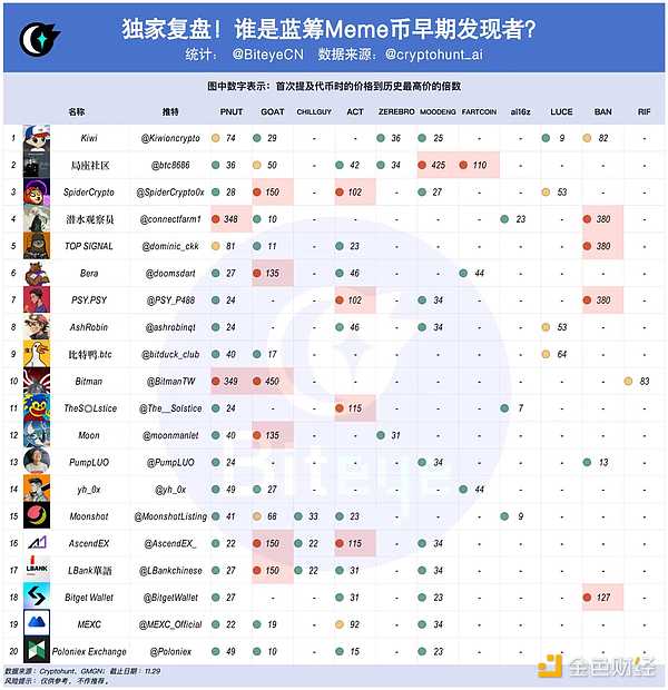 利用 CryptoHunt Meme 币分析功能,可以将该代币在推特上被提及的时间从早到晚排序,在代币最高价的 1/10 之前提及该代币的 KOL/ 机构视为在早期发现者。