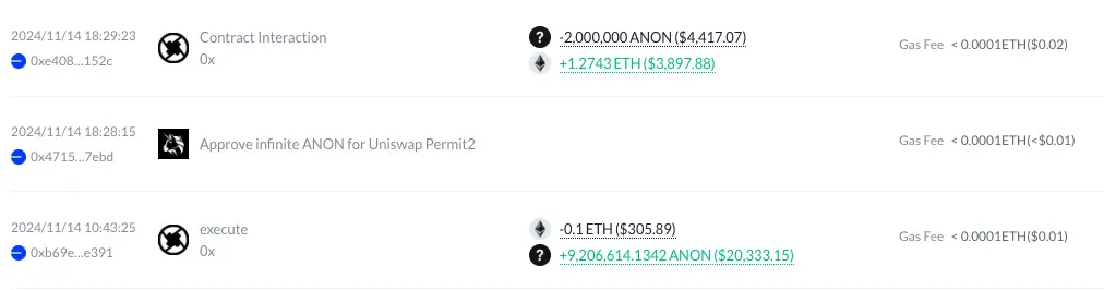 11 月 14 日,mopzy.eth 又买入了 0.1ETH ANON,这笔交易最后为其带来超过 25 枚 ETH 的回报。