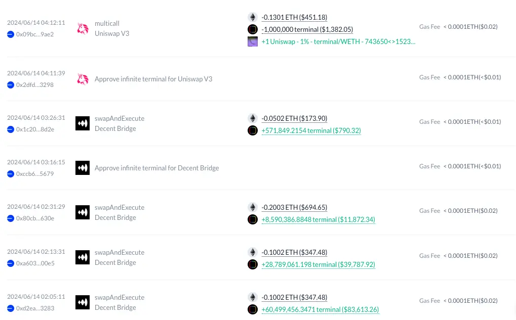6 月 14 日,mopzy.eth 曾在开盘买入了 0.1ETH 的 terminal,靠着这笔交易,他的钱包在几天内就拥有了 5 万美元。