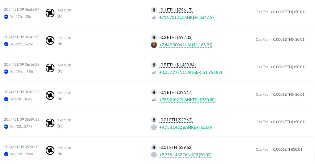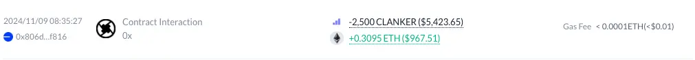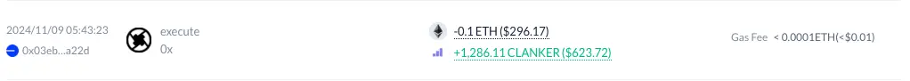 11 月 9 日,mopzy.eth 买入了价值 0.1ETH 的 CLANKER,彼时距离其开盘不到两小时。