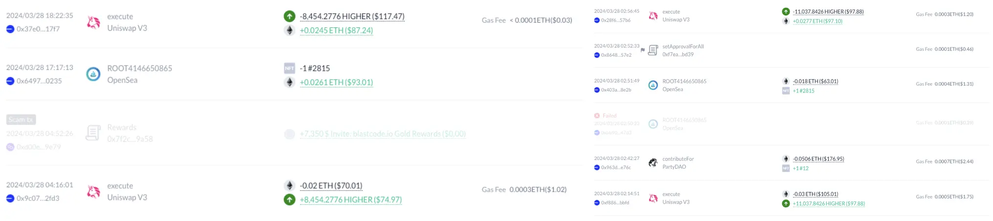 mopzy.eth 这个地址并没有参与 Farcaster 热潮下诞生的 DEGEN 交易,3 月 28 日,mopzy.eth 购买了价值 105 美元的 HIGHER。