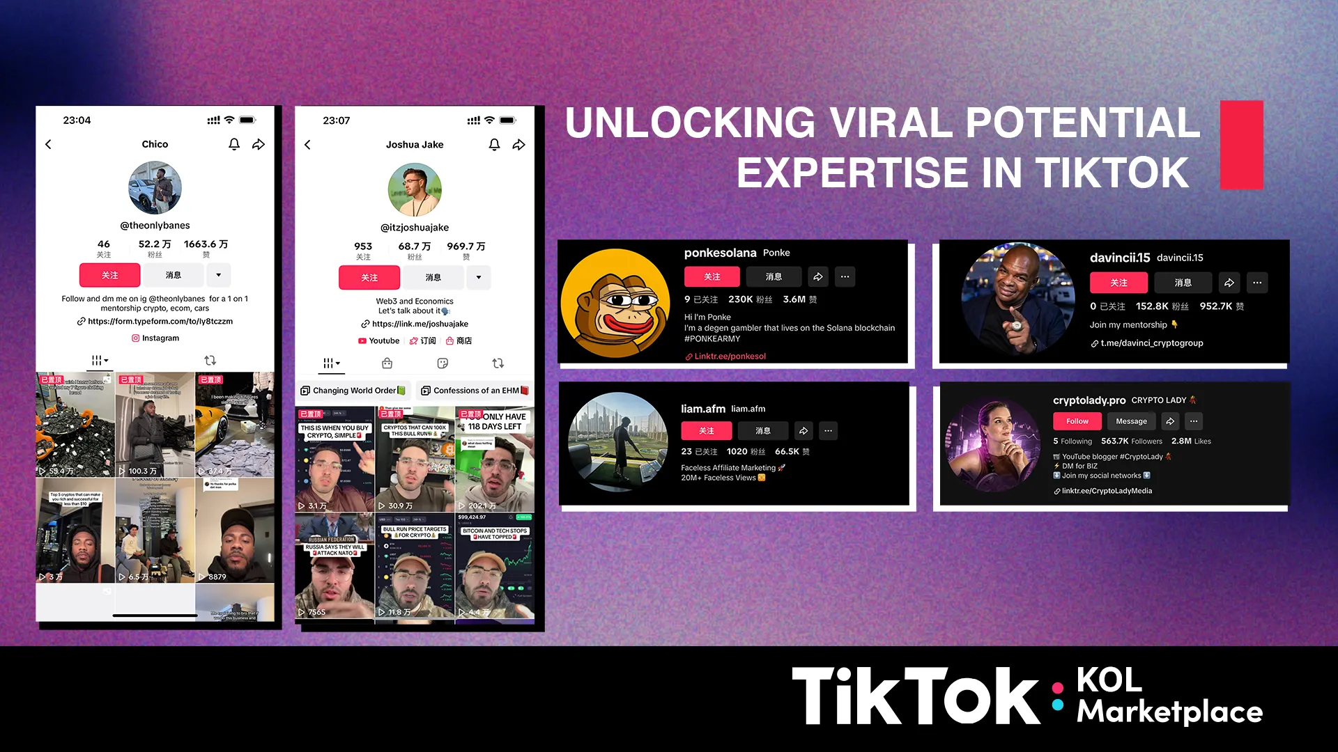 在我上一篇文章中提到要给大家写TK的运营和投流,是因为最近找过来合作TK的项目实在太多了,说白了还是Web3传统的老三样已经不够用了【也就是任务平台,合作PR,AMA或者KOL】,而ton的换量已经进入瓶颈期,这时候Tik ToK【后称TK】作为最大的流量池子,成为了兵家必争之地。如何用好TK的KOL,转化效果有时候比Twitter好得多。TK至今仍是巨大的流量洼地,我个人认为今年算是Web3和TK结合的元年,不抓好TK这波增长,大概率会错过这一轮的新流量,我们来看看账号如何运营以及运用什么样的打法来获取流量吧。