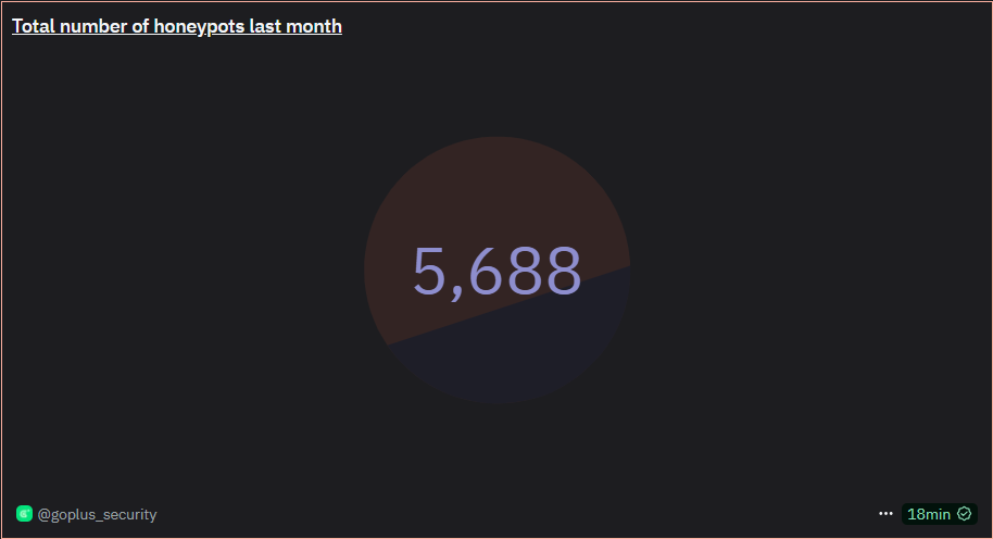 Web3 领域中最为典型的 Rugpull 类型是貔貅盘。GoPlus 的 Token 安全检测工具能够检测出 token 是否为貔貅盘。在过去的一个月中,GoPlus 共检测出 5688 个貔貅盘。更多安全相关的数据可访问 GoPlus 在 DUNE 中的数据仪表盘。