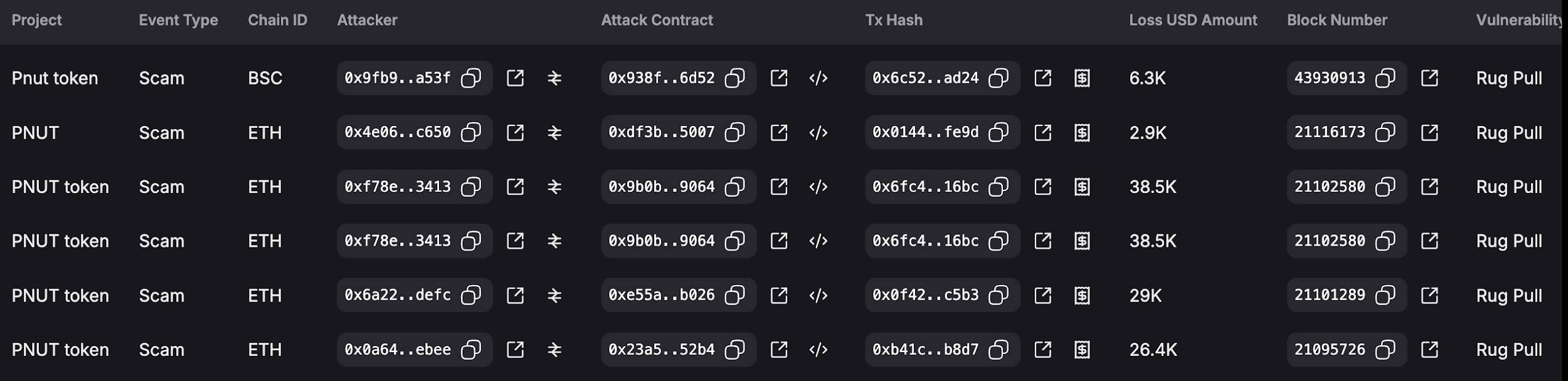 从11 月 1 日起,TenArmor 检测系统检测到 5 起冒充 PNUT token 的 Rugpull 事件。根据这篇推文的梳理,PNUT 在 11 月 1 日开始运营,并在 7 天内暴涨 161 倍,成功吸引到投资者的眼球。PNUT 运营并暴涨的时间点和诈骗者开始冒充 PNUT 的时间点非常一致。诈骗者选择冒充 PNUT 能吸引到更多不明真相的人上钩。