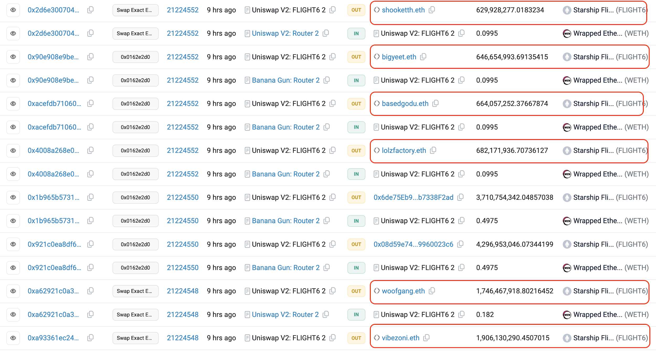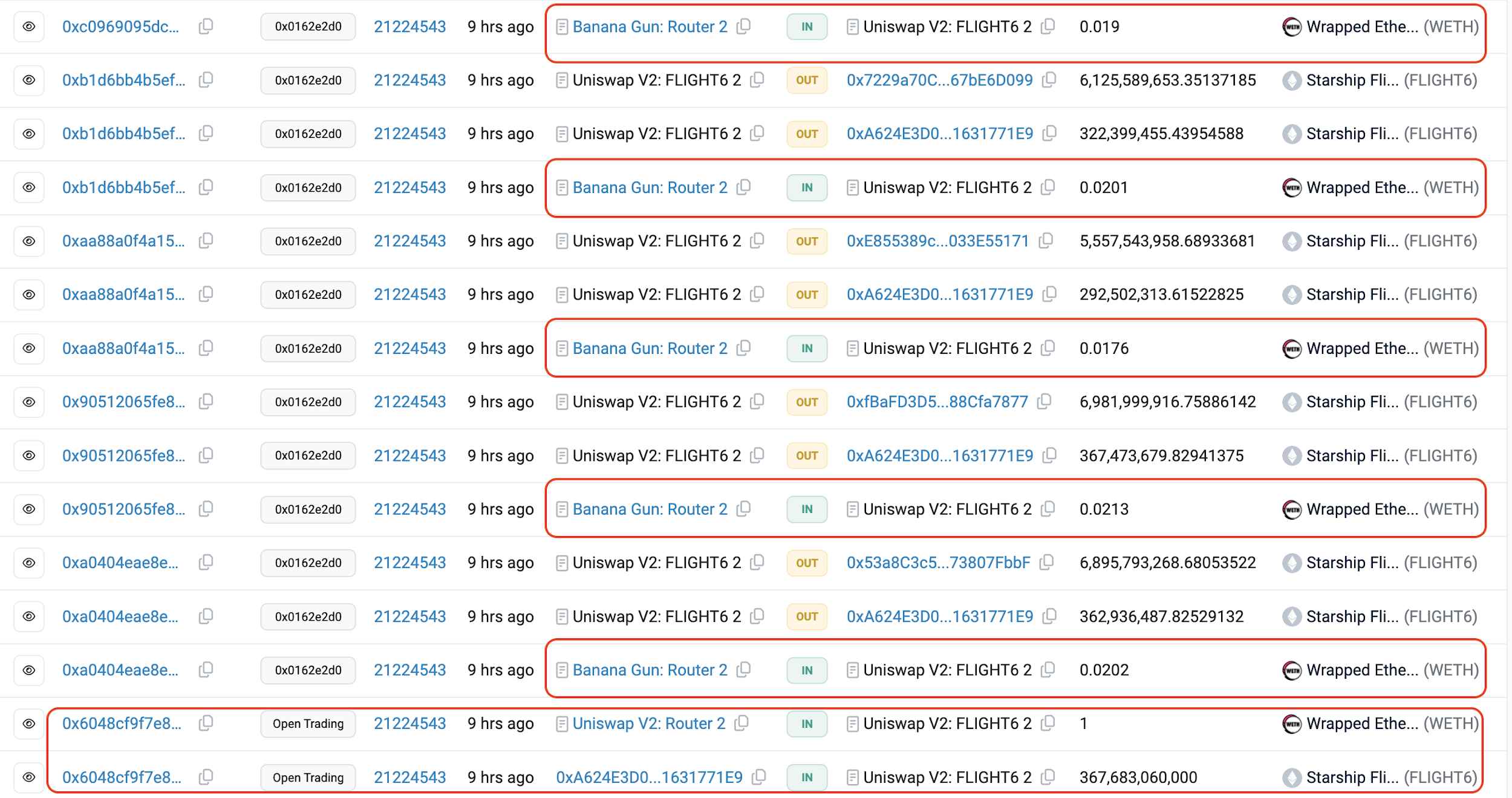 交易对被创建之后,立即有大量Banana Gun 打新机器人涌入小额兑换代币。分析之后不难发现这些打新机器人都是诈骗者控制的,目的是为了营造流量。