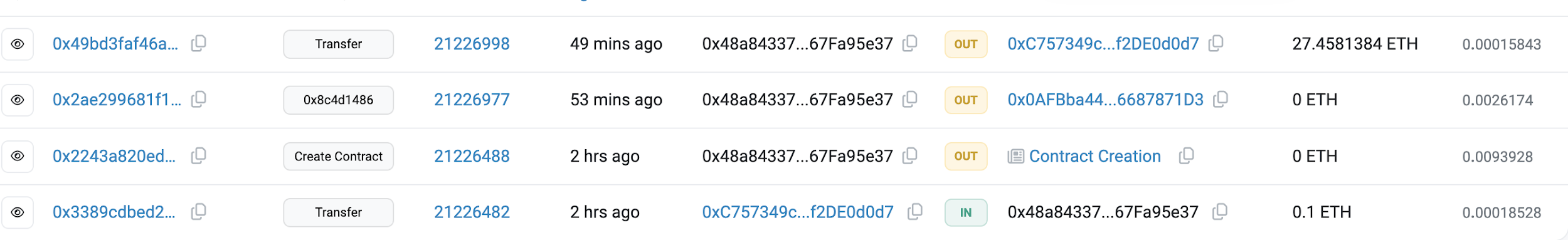 交易持续了一段时间之后,诈骗者部署了用于Rugpull 的合约,可以看到此合约的资金来自地址 0xC757。部署合约后,仅过了1小时 42 分钟即 Rugpull,一次性抽空了流动性池,获利 27 ETH。