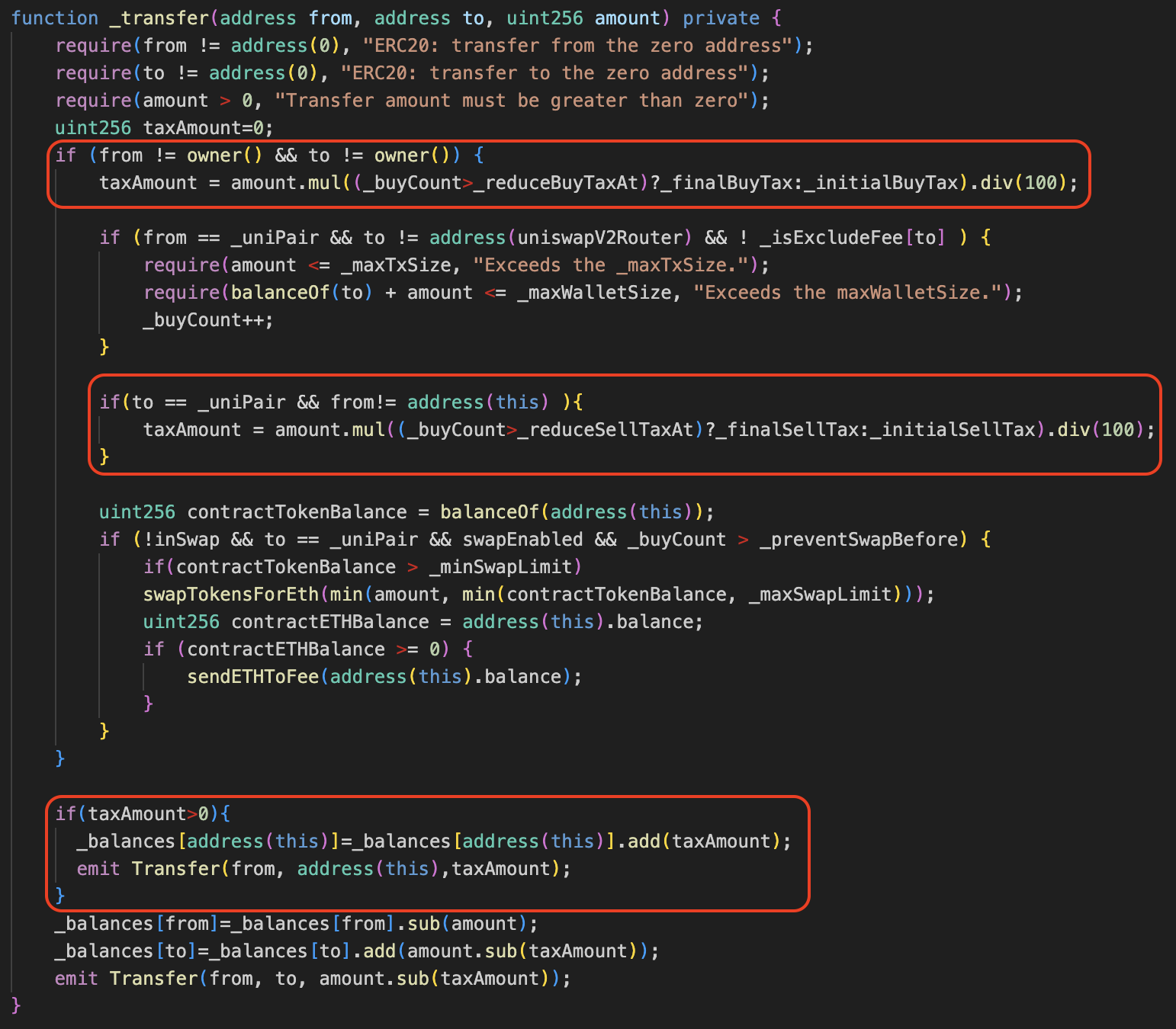 下图是FLIGHT的转账函数实现代码。可以明显的看到这个转账实现和标准实现存在巨大差异。每次转账都要根据当前的条件,来决定要不要收税。这个交易税使得买入和卖出都受到限制,这大概率是诈骗的币种。