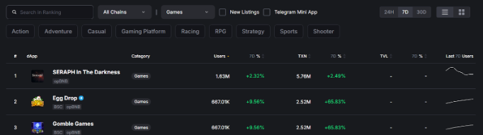 Seraph 从 2023 年 4 月开始 A 测,经历 B 测、Chaos Legacy Test、Preseason 和 Season 0,近期会开始 Season 1,官方显示参与玩家达到 90000,目前是 BNB Chain 上的头部游戏。BNB 孵化联盟(BIA)现场活动上均有设置 Seraph 展台,且在迪拜 Binance Blockchain Week 活动中在主展厅入口附近展出,币安首席执行官 Richard Teng 合照发推,侧面展示了 BNB Chain 对其生态龙头项目的大力支持。