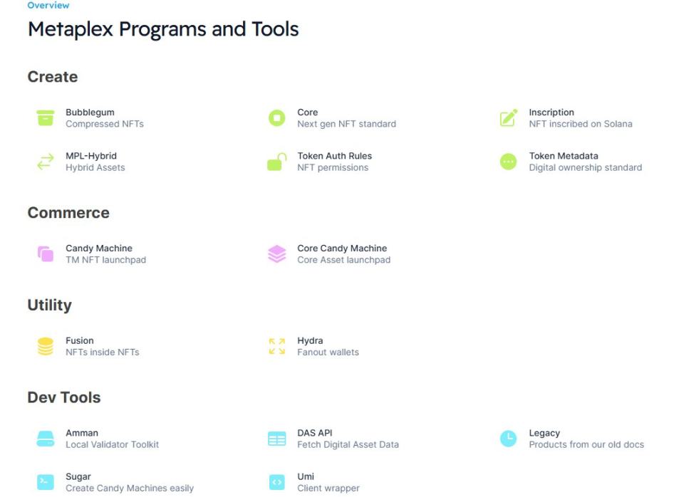 Metaplex 已有产品清单(资产服务类)如下: