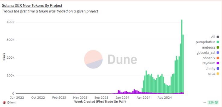 Solana Dex 每周新增的代币品种数量,来源:Dune