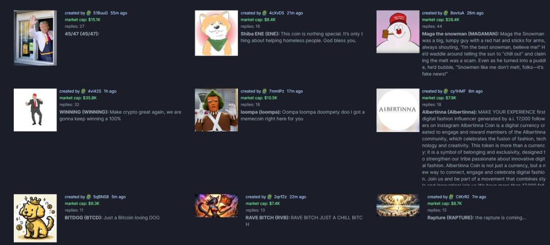 pump.fun 上不断刷新出现的新 Meme 代币,来源:pump.fun