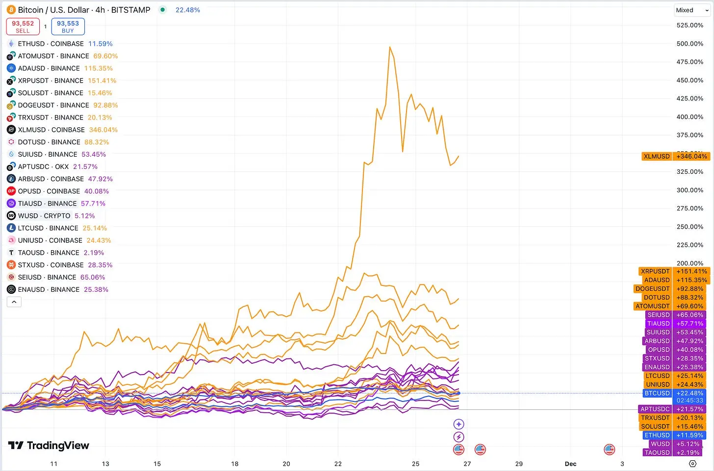 从历史上看,较新的山寨币(从 TGE,即 Token 生成事件起不到两年的 Token)通常会在不同时间段内持续跑赢老牌币种。然而,这次牛市却呈现出截然不同的趋势:老牌项目(如 $XLM、$XRP、$ADA、$DOT 和 $ATOM)成为市场的主导力量,而新币却表现平平。
