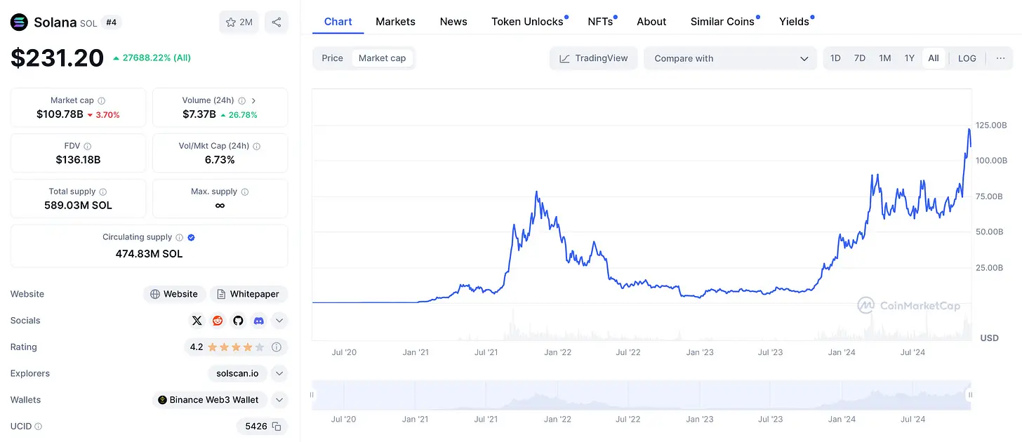 2021 年,$SOL 达到了 $258 的价格,当时的市值为 750 亿美元。而如今,它的价格仍然是 $258,但市值却增长到了 1220 亿美元。这一变化的背后是什么原因?答案是:流通供应量的增加。随着供应的扩大,单个 Token 的价值被通胀稀释,因此需要更高的市值才能维持相同的价格水平。