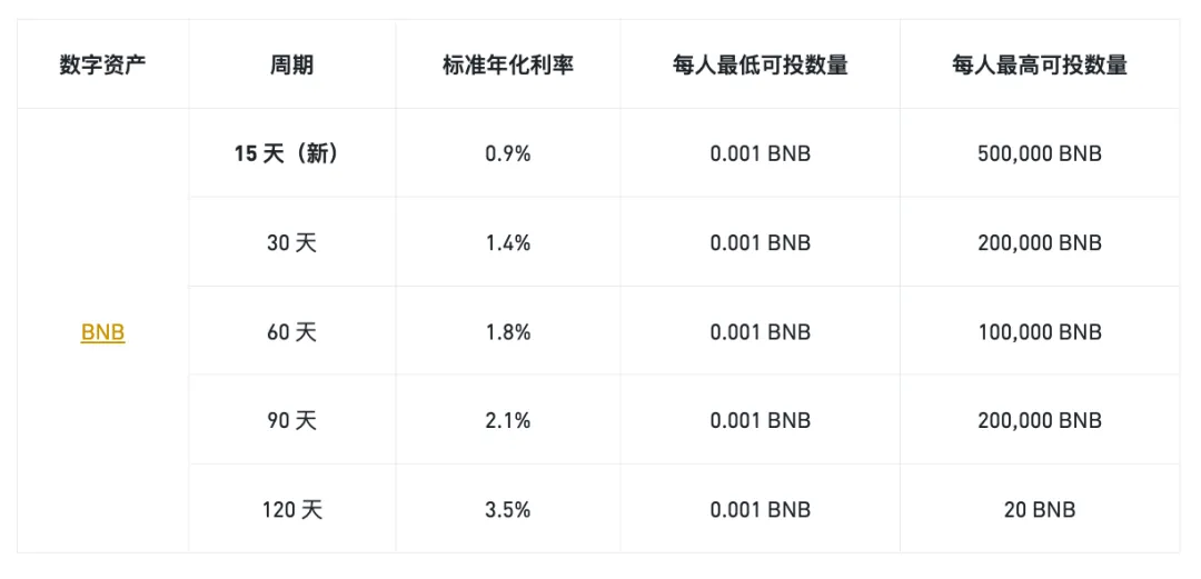 Binance 此前公布的产品收益列表,申购 BNB120 天定期产品的标准年化利率在 3.5% 左右。