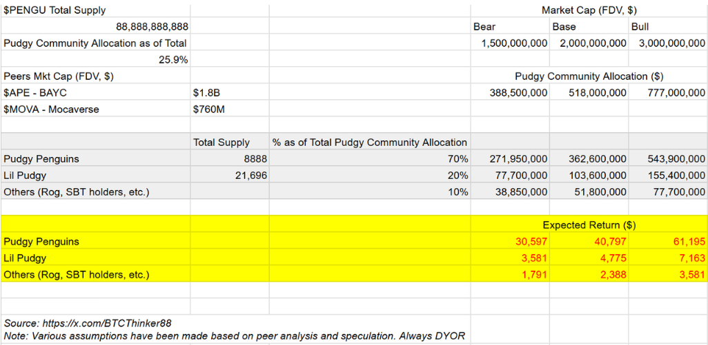 据社区用户 @BTCThinker88 分析,$PENGU 代币空投规模依然可观,Pudgy Penguins 持有者预计每人可获 31,000-61,000 美元(7.9 ETH-15.8 ETH)。如果 Abstract Chain 也为企鹅社区提供代币分配,这可能成为继 HYPE 之后 2024 年最大额的空投事件之一。