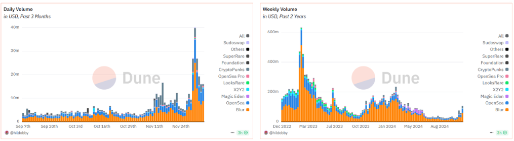 随着大盘持续上涨,溢出的资金也来到 NFT 生态。据 Dune 用户 @hildobby 数据统计,NFT 销售总额开始回暖,日交易额最高接近 4000 万美元,周交易额超 1 亿美元。
