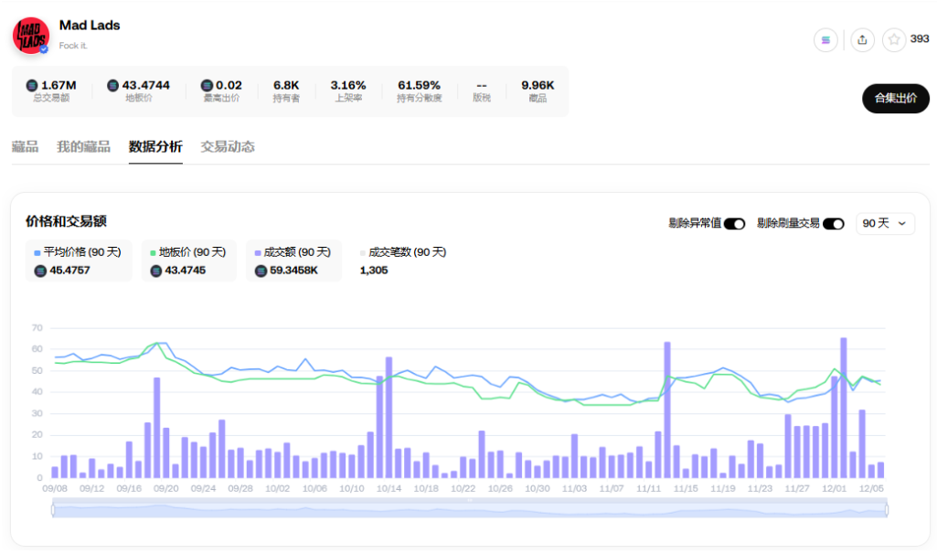 Azuki 当前地板价 6.1 E,距离 23 年 6 月那次社区 fud+断崖式下跌的均价 16 E 还有段距离,显然当前的价格还算不上“复苏”,更多是随着市场整体回暖一同上涨。