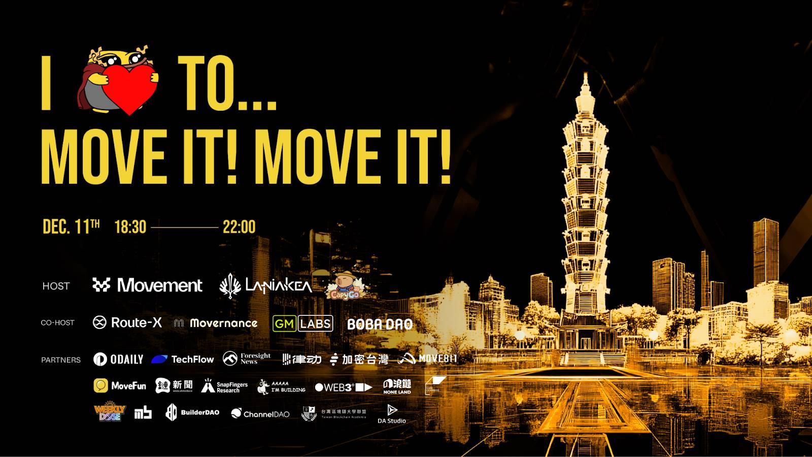 伴随 $MOVE 首发 Coinbase 的重磅消息,以及主网即将上线的万众期待,今年 12 月 11 日 Movement 响应台北区块链周特别举办了两场活动 ––「GMove Taipei — TBW2024」由 Movement 官方和生态项目带领大家了解最新开发近况与技术交流,以及「 I Like to... MOVE it MOVE it!」聚会与合作伙伴和社群朋友们共同回顾过往一年的重要里程碑,并预告明年的发展计划!