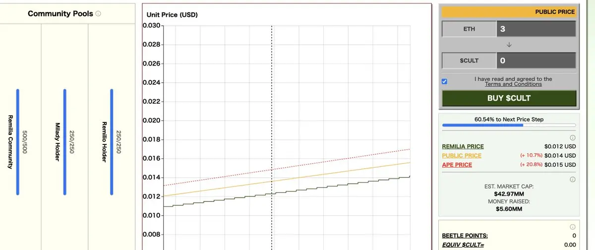12 月 9 日,Milady Cult 宣布,Milady 创始人 @CharlotteFang77 发布的预售 Meme 项目 CULT 已进行 TGE。而 Milady 项目早在今年 6 月就宣布了预售 Meme 代币 CULT。当时预售持续 7 天,总计筹集了 5861.8 枚 ETH,价值约 2053 万美元。