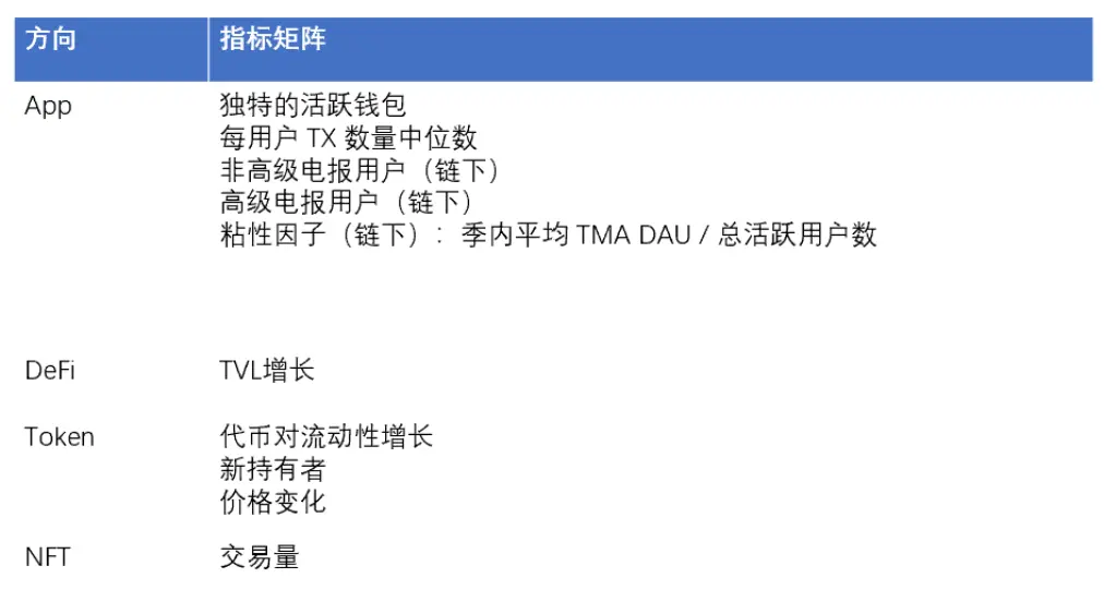 特别是在应用类别中,Telegram Mini Apps 的评估基于一系列链上互动指标(如独立活跃钱包和每用户交易量),以及在线指标,包括 Telegram 的用户数和 Mini-App 的用户粘性。