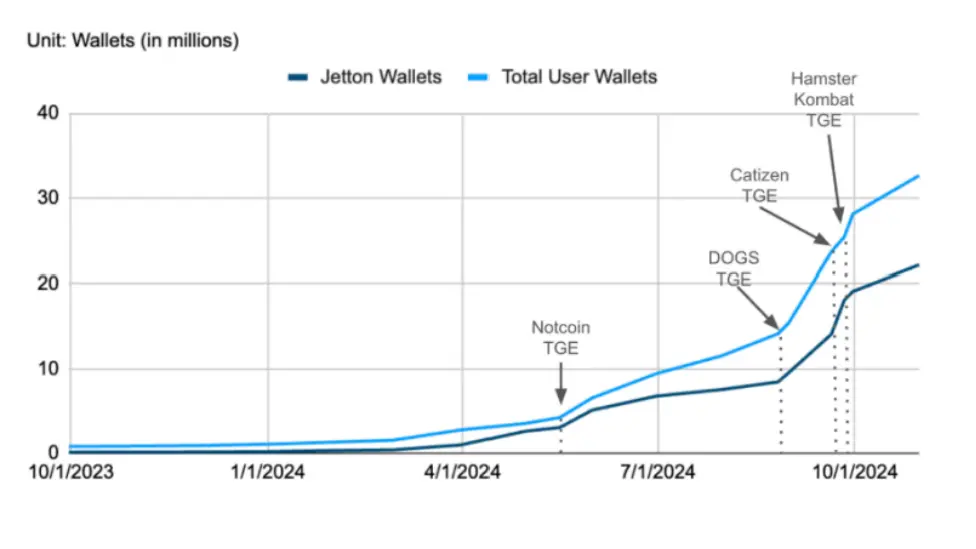 到 2024 年 11 月 1 日,TON Space(Telegram 的非托管钱包)的注册用户已达到 1 亿,而 TON 区块链上(包括 TON Space 和第三方链上钱包)的总激活钱包数达到 3400 万。