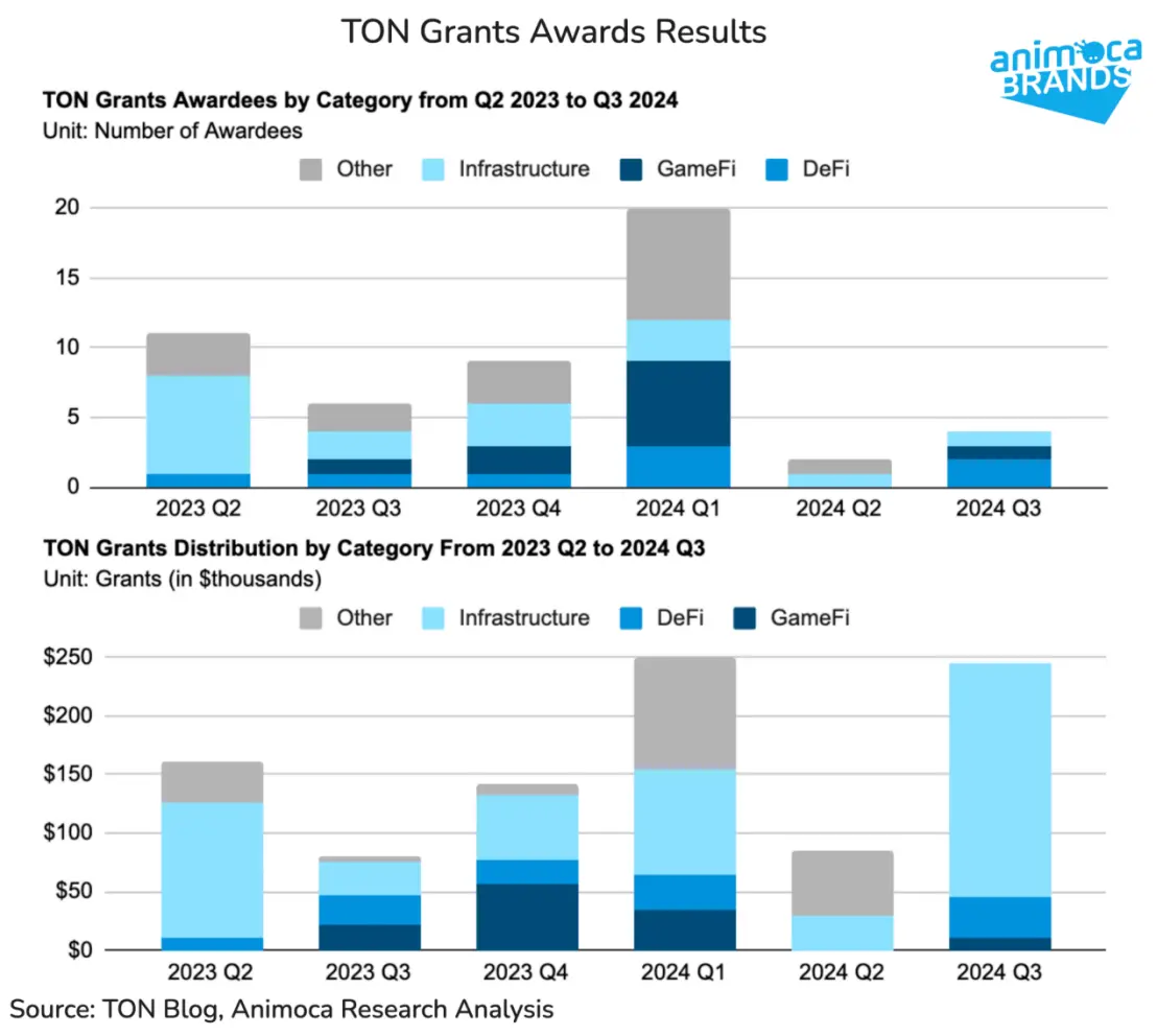 2024 年第三季度,TON Grants的受助项目中开始出现GameFi项目,与传统链上功能项目并列。这一变化表明,基金会已意识到游戏开发在推动Mini-App普及方面的重要潜力。