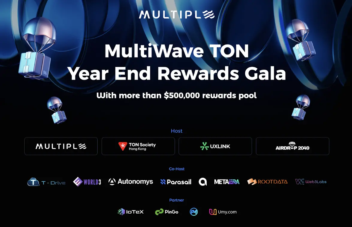 随着BTC突破十万大关,全球市场正迎来加密货币的又一波热潮,为了抓住这一波牛市红利, Multiple Network 携手 TON Society、UxLink 和 Airdrop2049 主办的「MultiWave TON年底空投嘉年华」将于 12月12日 盛大上线。这场年度盛会联合了 T-Drive、World3、Autonomys Network、Parasail、NFA、Meta Era、RootData、Web3Labs等平台作为联合主办方,并吸引了IoTex、PinGo、PumpMeme、Umy等知名项目方参与,旨在为全球用户带来一场充满活力与惊喜的加密盛宴。