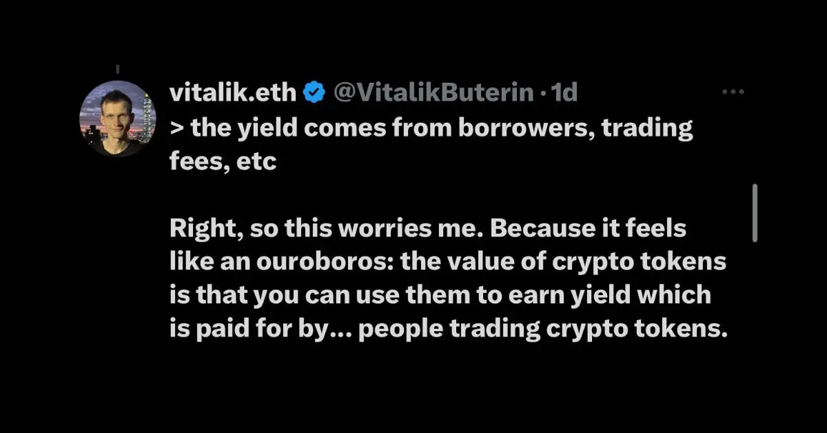 Vitalik 曾形容 DeFi 是“自噬蛇 (ouroboros)”,暗指其自我循环却缺乏创新