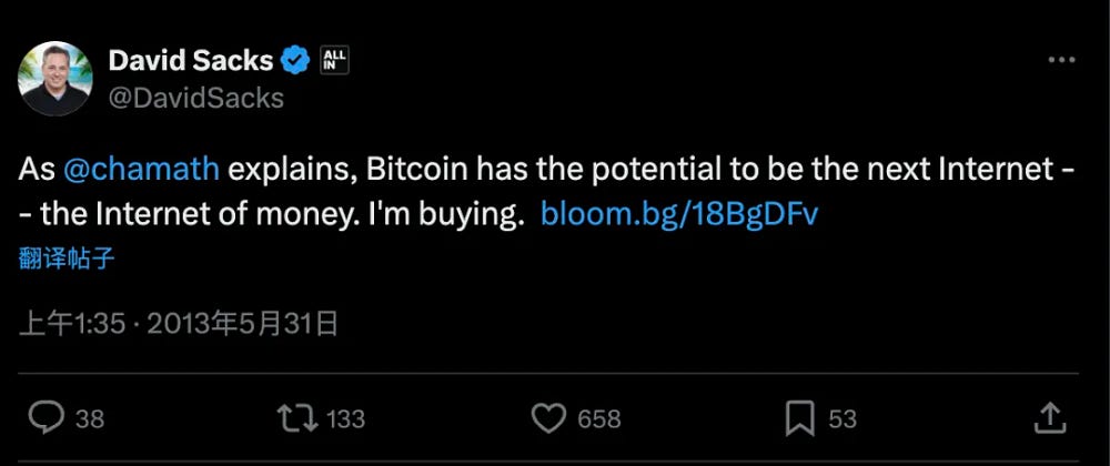 正如@chamath 所解释的那样,比特币有可能成为下一个互联网 — 货币互联网。我要买。— — David Sacks 于 2013 年 5 月 31 日发文表示