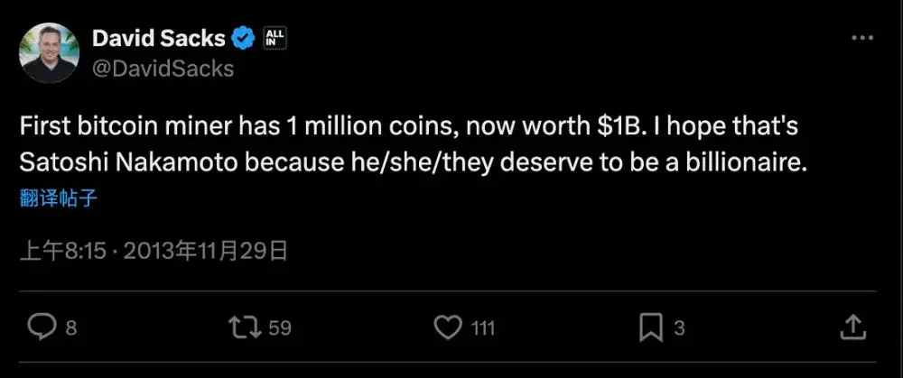 第一个比特币矿工拥有 100 万枚比特币,现在价值 10 亿美元。我希望这个人是中本聪,因为他 / 她 / 他们应该成为亿万富翁。— — David Sacks 于 2013 年 11 月 29 日发文表示
