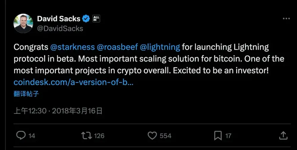祝贺 starkness、roasbeef 和 lightning 推出了 Lightning 协议的测试版。这是比特币最重要的扩展解决方案,也是整个加密行业最重要的项目之一。很高兴成为一名投资者!— — David Sacks 于 2018 年 3 月 16 日发文表示