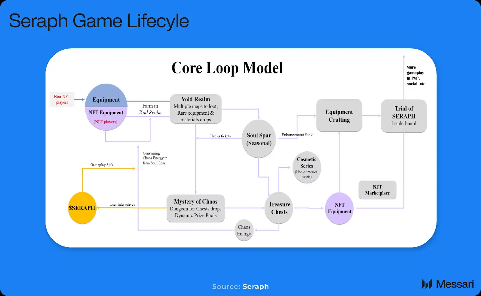 所有玩家在游戏进程中都可以获得稀有的资产输出,尤其是在虚空异界(Void Realm)中。装备了NFT装备的玩家可以通过击败虚空异界副本中的怪物,并消耗NFT装备的混沌能量,生产灵魂晶石(Soul Spars),这是游戏内的主要货币。魂晶并非链上资产,其主要用途有四种: