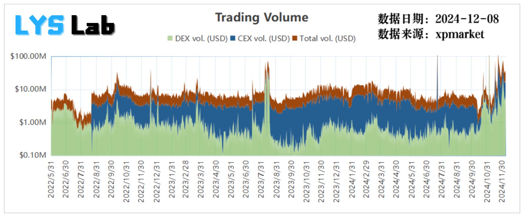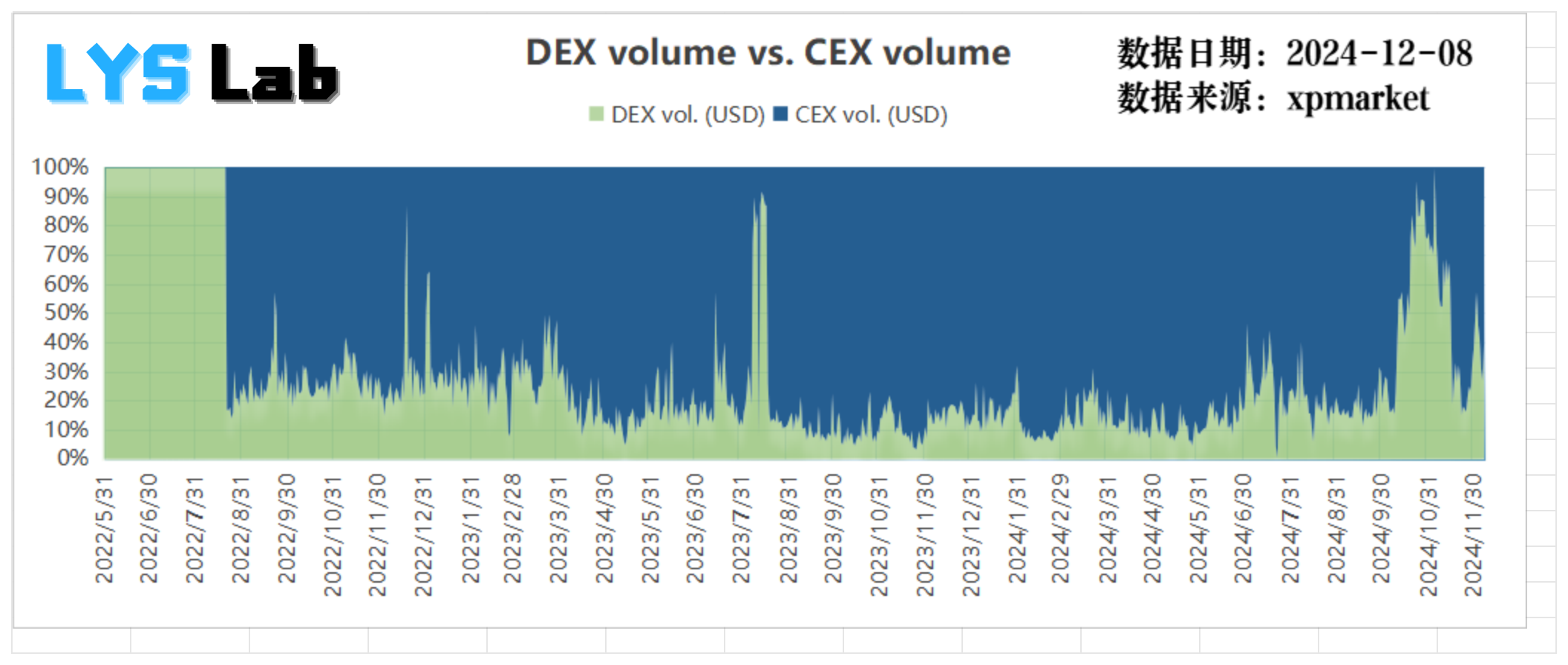 根据上面这幅图可以看清楚 DEX 和 CEX 的交易体量占比情况,CEX 自 2022 年 8 月初有数据以来,几乎瞬间就占据了主导态势,此后的大多数时间段还是 CEX 交易量占主导,其中有部分时间段 DEX 占比短暂大幅提升,可能是 meme 热潮的结果。