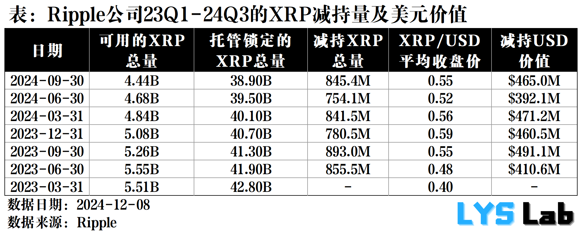 可以看出,在 23Q1-24Q3 这个时间段内,每季度 Ripple 减持约 800M(8 亿)以上的 XRP 代币,价值几乎都在 400M(4 亿)美元以上。