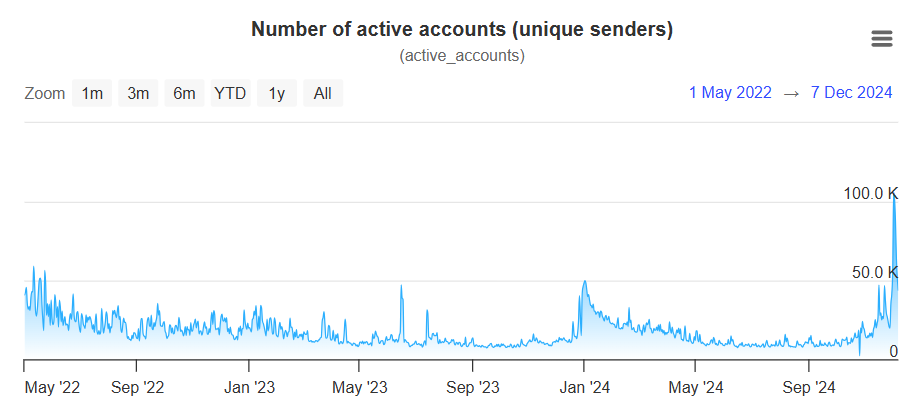 截至 2024 年 12 月 8 日,XRPL 的最新日活 12 月初达到了历史新高(注意 XRPScan 中该项数据自 2022 年 5 月起才有记录),为 105,956。新的一周日活量有所下降,但是仍然维持在历史高位。